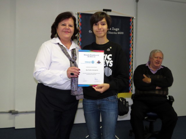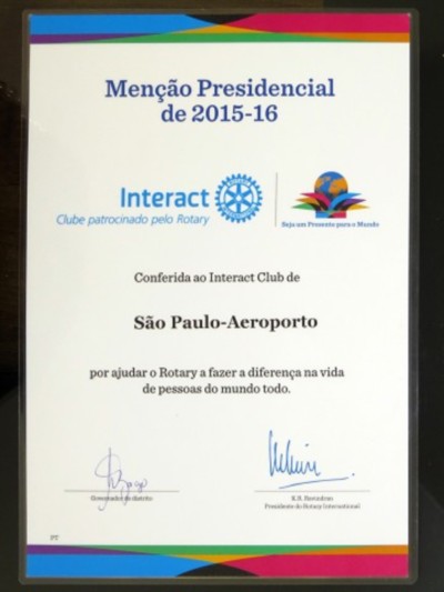 A Presidente 2015-2016 do Interact São Paulo Aeroporto Caroline Carvalho recebeu das mão da Governadora a Menção Presidencial enviada pelo Presidente de RI Ravi Ravindran, por ter cumprido todas as metas propostas antes do início do ano rotário.