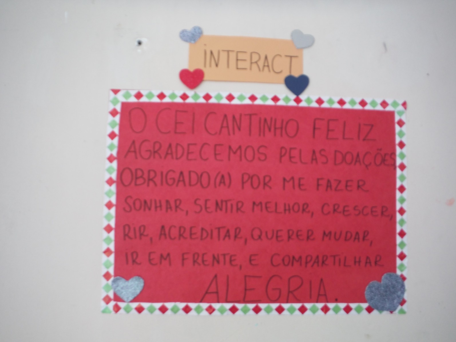 O evento, coordenado pela presdiente do Interact Isabela Kobayashi, foi realizado em comemoração ao Dia das Crianças, e além da apresentação os interactianos efetuaram ainda a entrega de lembrancinhas para as crianças. O Cantinho Feliz é uma entidade que atende a crianças de uma comunidade carente na região da Saúde, em São Paulo, e tem recebido diversas ações do clube, como a doação de equipamentos (batedeira, liquidificador) e pisos emborrachados para as salas de aula. Os custos do evento e das doações são suportados pelas verbas obtidas no strogonoff beneficente que o clube realiza anualmente.