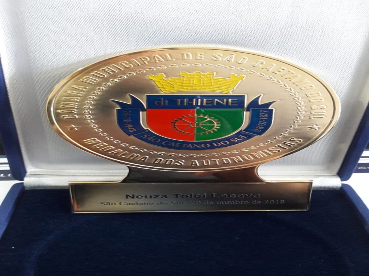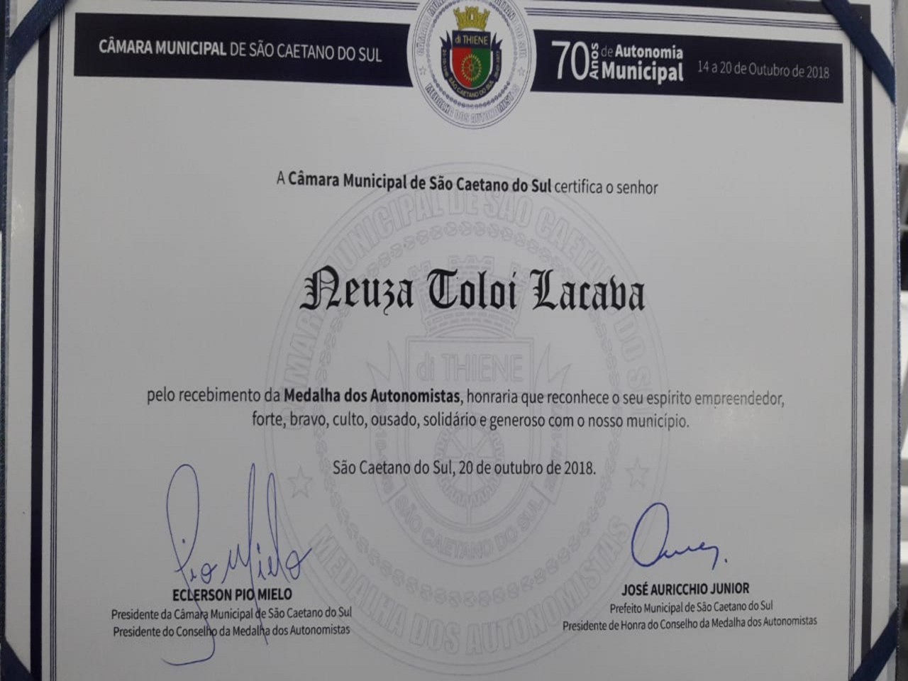 No ultimo dia 20/10/2018 na Câmera Municipal de São Caetano do Sul a Presidente do Rotary Club de São Caetano do Sul Leste, Sra. Neuza Coloi Lacaba, recebeu das mão do Prefeito José Auricchio Junior, a Medalha dos Autonomistas.