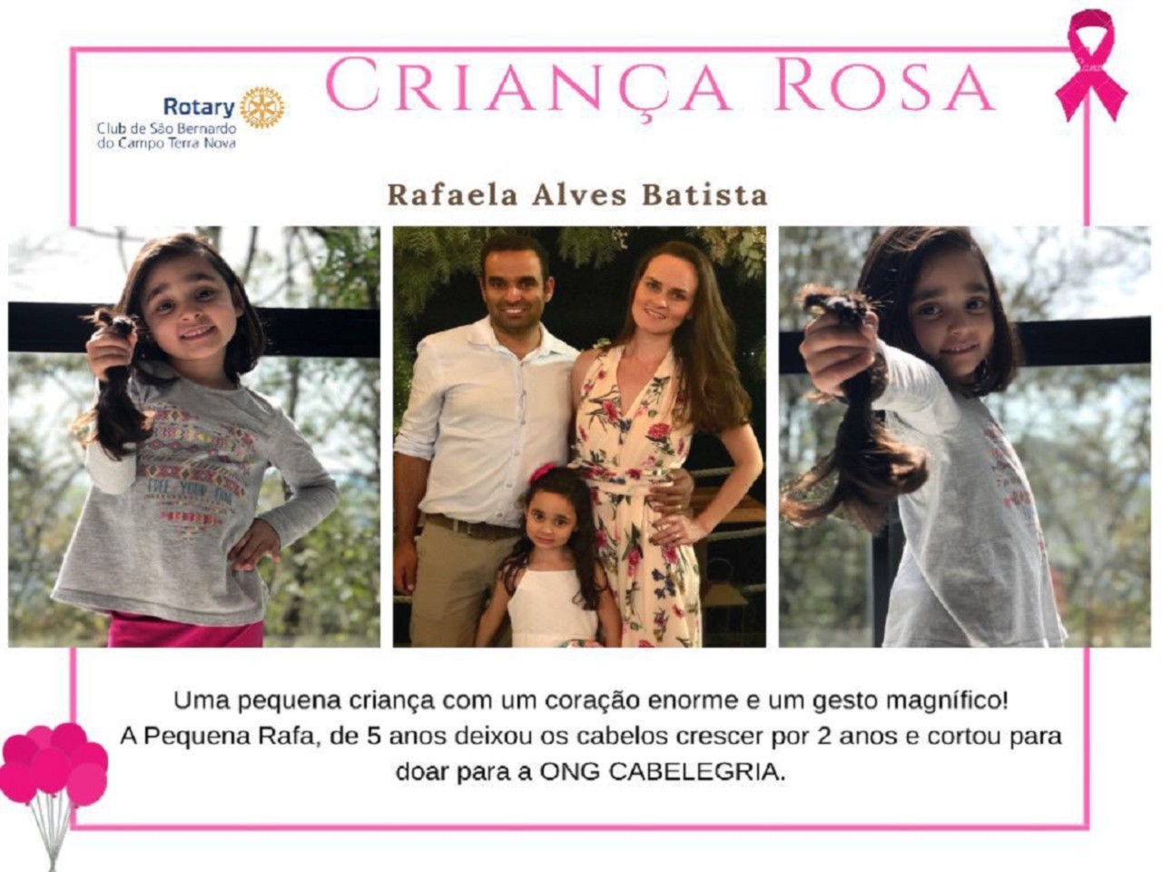 Diante disso, nada mais gratificante, do que homenagear essa pequena por uma atitude tão magnifica, nesse mês que temos o Dia das Crianças e o Outubro Rosa.