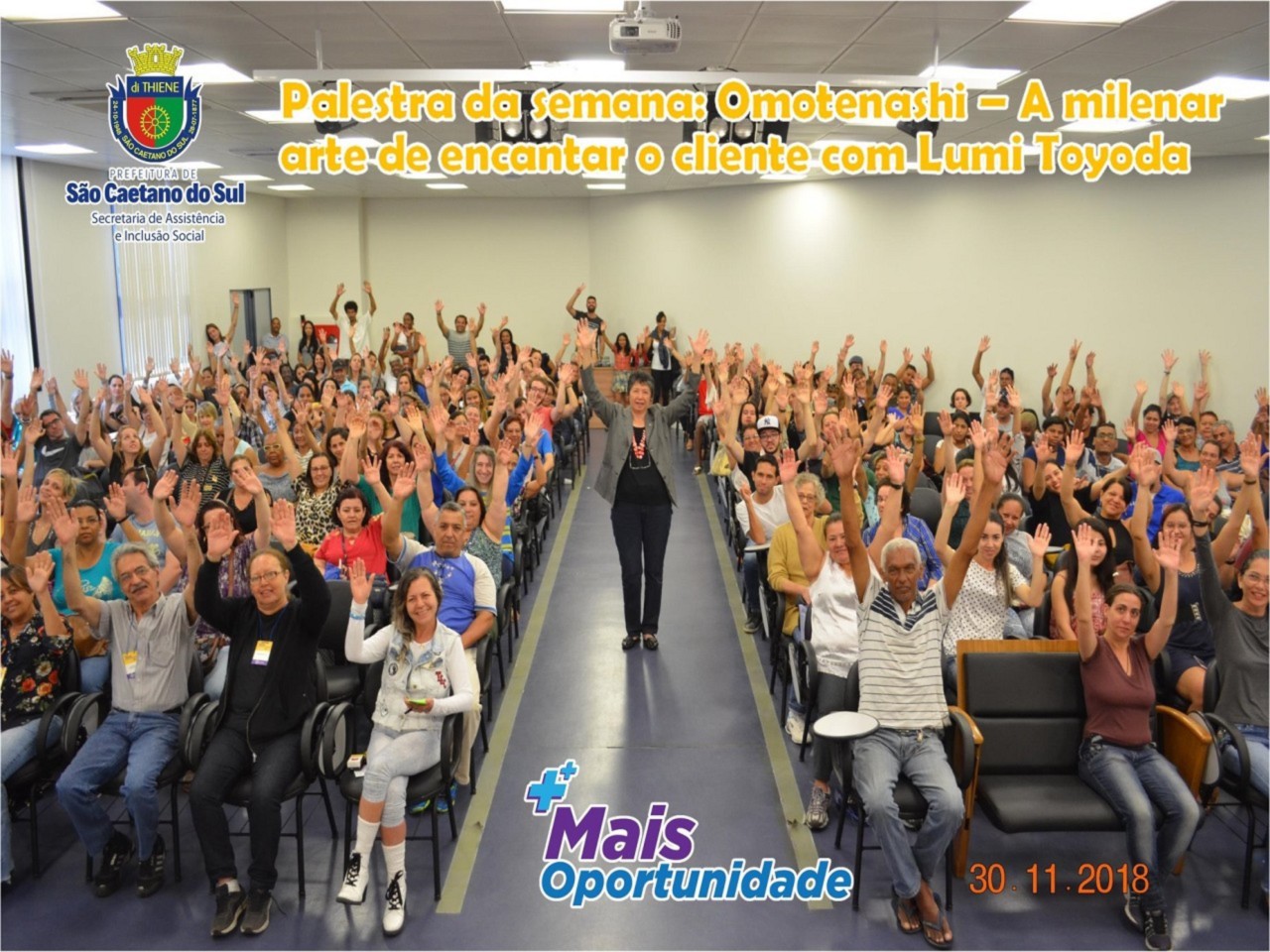 O Rotary Club de São Caetano do Sul-Leste participou, através da Companheira Lumi Toyoda, no Encontro Mais oportunidade promovido pela Prefeitura Municipal de São Caetano do Sul com a palestra Omotenashi ? A milenar arte japonesa de encantar o cliente. Realização CRAS-Centro de Referência de Assistência Social e SEAIS-Secretaria de Assistência e Inclusão Social.